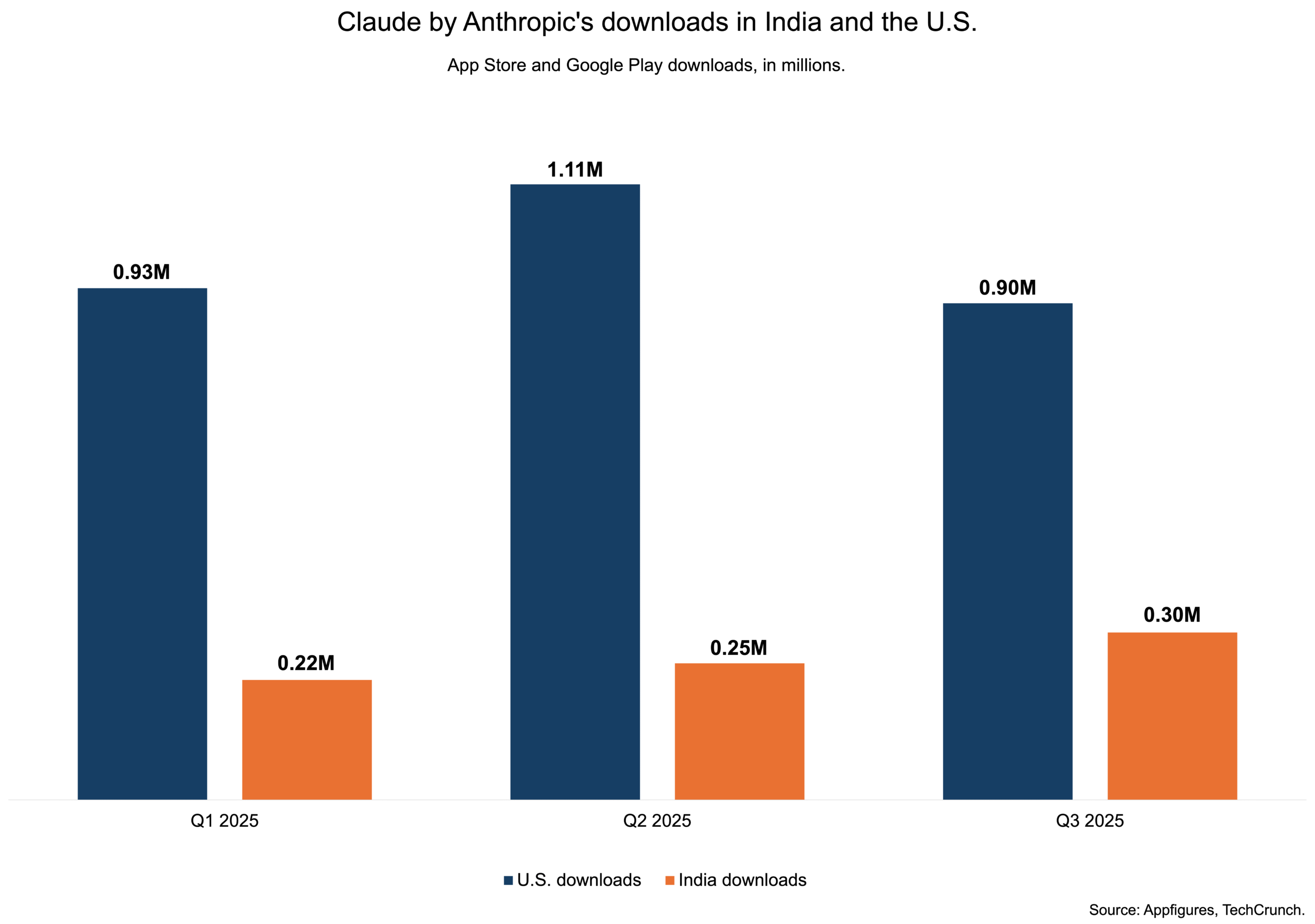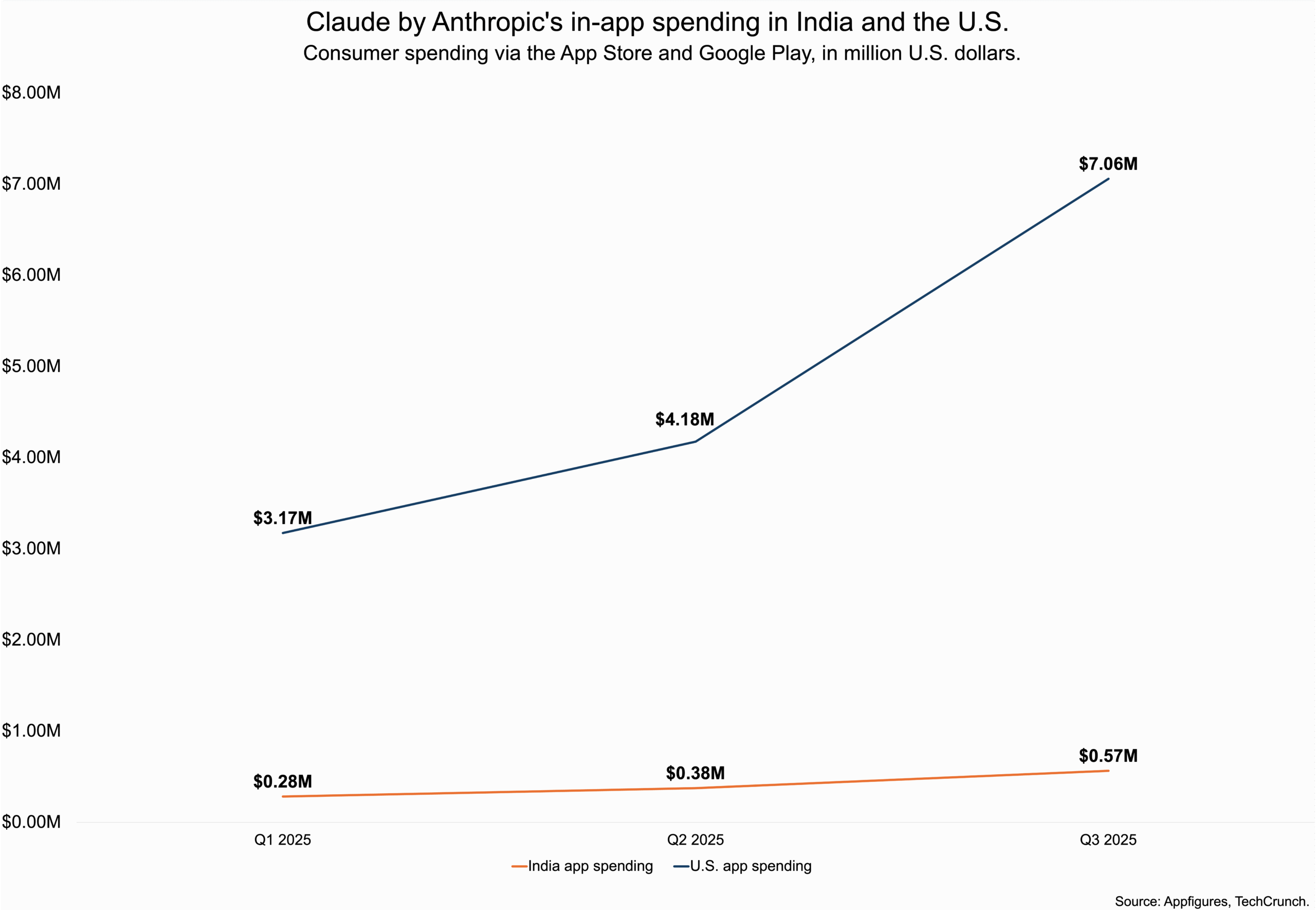 با این حال، ارقام هند در مقایسه با ارقام ایالات متحده، که در آن دانلودها 91 درصد و هزینه مصرفکنندگان 604 درصد افزایش یافته است، همچنان متوسط است. به گزارش Appfigures، کاربران آمریکایی در شهریور ماه 2.5 میلیون دلار برای اپلیکیشن Claude هزینه کردهاند. در سطح جهانی، این اپلیکیشن شاهد رشد 74 درصدی در دانلودها به 1.01 میلیون و افزایش 546 درصدی در هزینه مصرفکنندگان به 5.62 میلیون دلار در همان ماه بوده است.