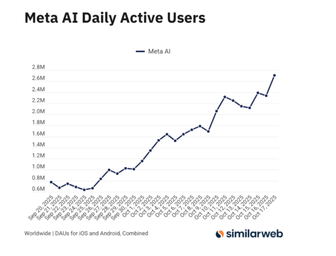 اطلاعات جدید نشان میدهد که استفاده از اپلیکیشن موبایل Meta AI برای سیستمعاملهای iOS و Android با افزایش چشمگیری مواجه شده است. بر اساس تحلیل جدیدی از شرکت Similarweb، که در زمینه تحلیل بازار فعالیت میکند، تعداد کاربران فعال روزانه این اپلیکیشن در هر دو پلتفرم تا تاریخ ۲۵ مهر ۱۴۰۴ (17 اکتبر 2025) به ۲.۷ میلیون نفر رسیده است، در حالی که این رقم تنها چهار هفته قبل حدود ۷۷۵,۰۰۰ نفر بود. علاوه بر این، نصب اپلیکیشن Meta AI نیز افزایش یافته و به ۳۰۰,۰۰۰ دانلود جدید در روز رسیده است، در حالی که این رقم چند هفته قبل کمتر از ۲۰۰,۰۰۰ دانلود روزانه بود.
