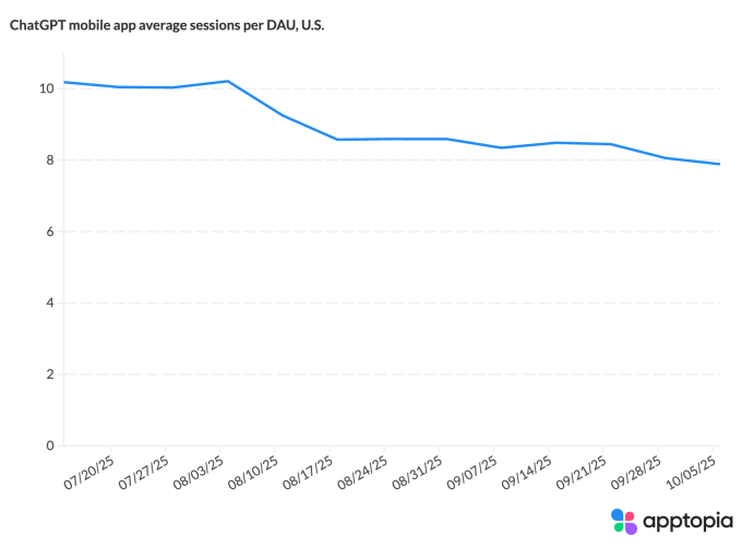 با این حال، Apptopia اشاره میکند که میانگین زمان صرف شده برای هر کاربر فعال روزانه و میانگین تعداد جلسات برای هر کاربر فعال روزانه ChatGPT قبل از افزایش شدید رقیب خود، Gemini گوگل، روند نزولی داشت. Gemini به لطف انتشار مدل جدید هوش مصنوعی تصویر گوگل، Nano Banana، در شهریور ماه به صدر جدولها صعود کرد.