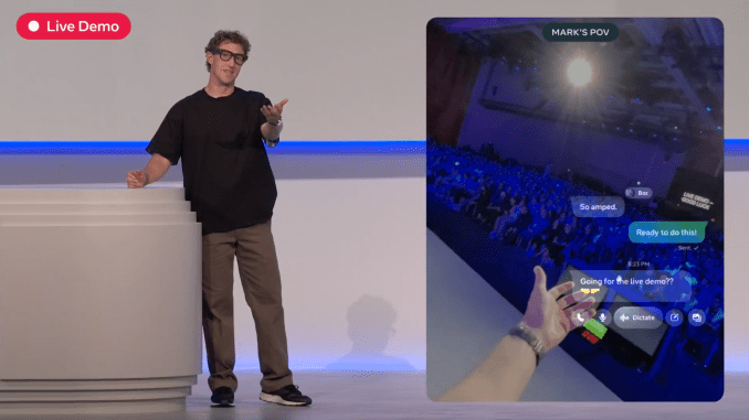 در حالی که برخی از نمایشهای زنده هوش مصنوعی در سخنرانی اصلی با شکست مواجه شدند – زاکربرگ Wi-Fi را مقصر دانست – ما حداقل توانستیم مچبند را در عمل ببینیم، که تازگی بیشتری داشت. زاکربرگ به سرعت پیامهای متنی را نوشت، سپس آنها را روی Ray-Ban خود ارسال کرد.