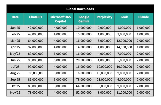 همچنین، تا آبان ماه، دانلودهای جهانی ChatGPT نسبت به سال قبل ۸۵٪ افزایش یافت، اما این رقم از میانگین رشد ۱۱۰٪ کل گروه عقبتر بود.