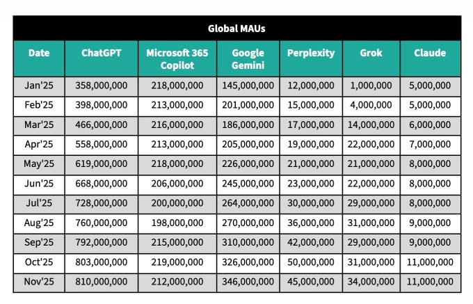 تا آبان ماه سال ۱۴۰۴، کاربران فعال ماهانه جهانی ChatGPT نسبت به سال قبل ۱۸۰٪ افزایش داشته است، در حالی که کاربران فعال ماهانه Gemini با ۱۷۰٪ رشد همراه بودهاند.