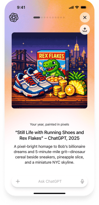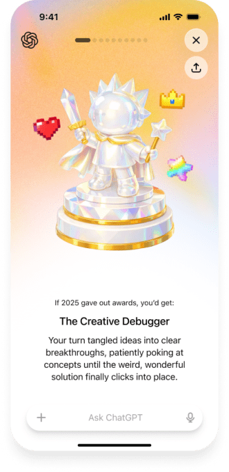 مشابه دیگر بررسیهای سالانه که توسط اپلیکیشنهای مصرفی ارائه میشود، «سال شما با چتجیپیتی» از ایده بازبینی سالانه الهام گرفته است. مانند اسپاتیفای، OpenAI با استفاده از طراحیهای جذاب و شخصیسازی شده، این تجربه را بر اساس نحوه استفاده شما از چتجیپیتی در طول سال، با ارائه «نشانها» و افتخارات ویژه برگزار میکند.