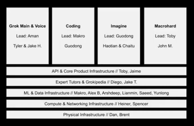 در ساختار جدید سازمانی، xAI به چهار تیم اصلی تقسیم شده است: یک تیم متمرکز بر چتبات Grok (شامل نسخه صوتی)، تیم دیگر مسئول سیستم کدنویسی اپلیکیشن، تیم سوم برای تولیدکننده ویدئو Imagine و در پایان تیم پروژه Macrohard که از شبیهسازی کاربری ساده رایانه تا مدلسازی شرکتهای بزرگ را شامل میشود.