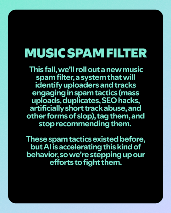 از آنجایی که ابزارهای هوش مصنوعی انتشار موسیقی را برای همه آسان‌تر کرده‌اند، اسپاتیفای برنامه جدیدی برای کاهش حجم محتوای اسپم دارد. این شرکت در پاییز امسال یک فیلتر جدید برای شناسایی محتوای اسپم راه‌اندازی می‌کند که تلاش می‌کند تاکتیک‌های اسپم را شناسایی، برچسب‌گذاری و سپس از پیشنهاد این آهنگ‌ها به کاربران جلوگیری کند.