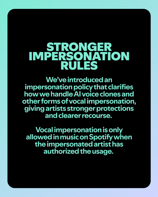 اسپاتیفای همچنین در این اطلاعیه سیاست‌های خود را در مورد شخصی‌سازی مبتنی بر هوش مصنوعی روشن کرد و به صراحت اعلام کرد که شبیه‌سازی‌های غیرمجاز صدا با هوش مصنوعی، دیپ‌فیک‌ها و هر نوع تقلید صدا مجاز نیست و از این پلتفرم حذف خواهد شد.