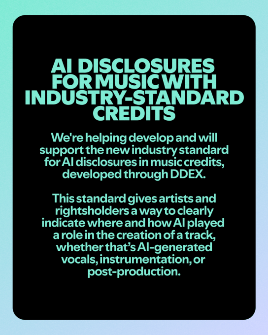 این شرکت اعلام کرده که از استاندارد صنعتی جدیدی برای شناسایی و برچسب‌گذاری موسیقی‌های تولید شده با هوش مصنوعی در بخش اطلاعات آهنگ (credits) با نام DDEX استفاده خواهد کرد و به زودی یک فیلتر جدید برای شناسایی محتوای اسپم راه‌اندازی می‌کند تا جلوی فعالیت‌های مخرب گرفته شود.